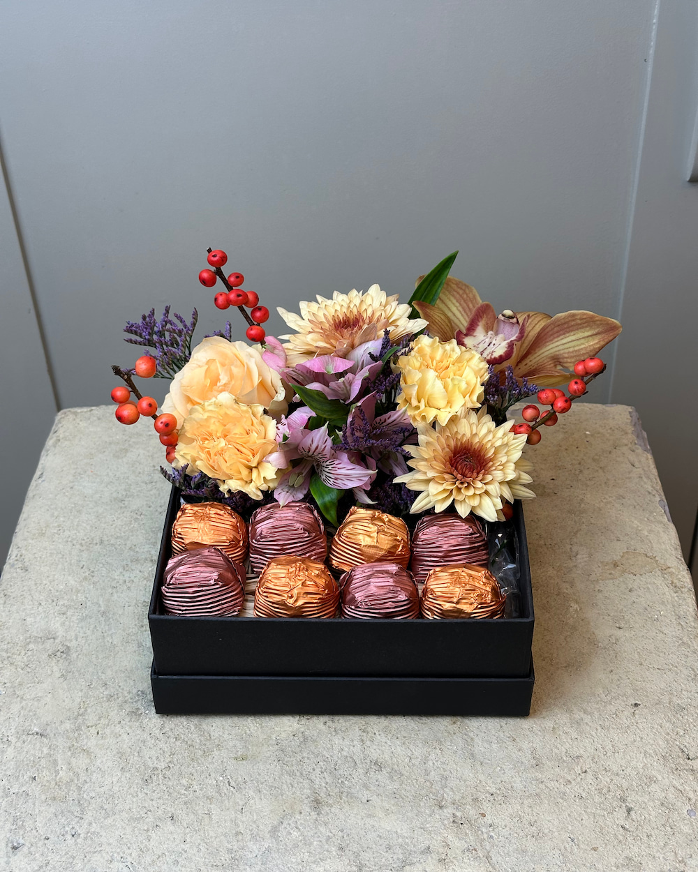 8 adet turuncu ve rose gold sargılı fındık kaplı çikolata yanında hazırlanan aranjman; öğretmenlerimiz için harika bir hediye önerisi olacaktır